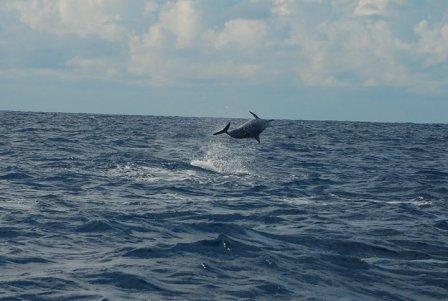 Setelah sekian lama, kondisi tidak juga membaik; kami benar-benar sudah hampir kehabisan energi dan siap untuk kembali ke pulau saja. Tapi baru saja gua mau membuka mulut untuk meminta pengemudi jukung untuk berputar haluan, tiba-tiba saja, sekitar 10 meter di depan jukung kami, seekor makhluk meloncat dari dalam air, tubuh abu-abunya basah berkilauan, berputar-putar di udara selama beberapa detik, dan mencebur lagi ke dalam air. Gua dan Duy bengong selama beberapa saat, dan lalu berteriak-teriak kegirangan layaknya anak umur 2 tahun yang melihat badut ditendang selangkangannya.