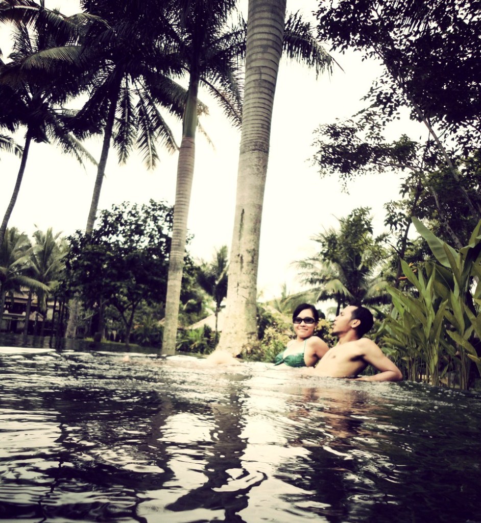 Dan disanalah kami menghabiskan malam, duduk melihat sawah,  membaca, berenang,  berbicara tak henti sambil minum teh beras, termenung dengan musik angklung yang terdengar sayup, tidur di ranjang bertirai yang luar biasa empuk. Saya, anak tak terurus yang suka berlibur ke tengah hutan ini, bahkan mandi dengan air bunga. Norak minta ampun. Malam harinya kami diberikan compliment berupa chocolate cake dengan tulisan ‘happy honeymoon’. Kami dikira pasangan yang sedang berbulan madu. Kami pun terkikik-kikik geli dan makan dengan lahap.