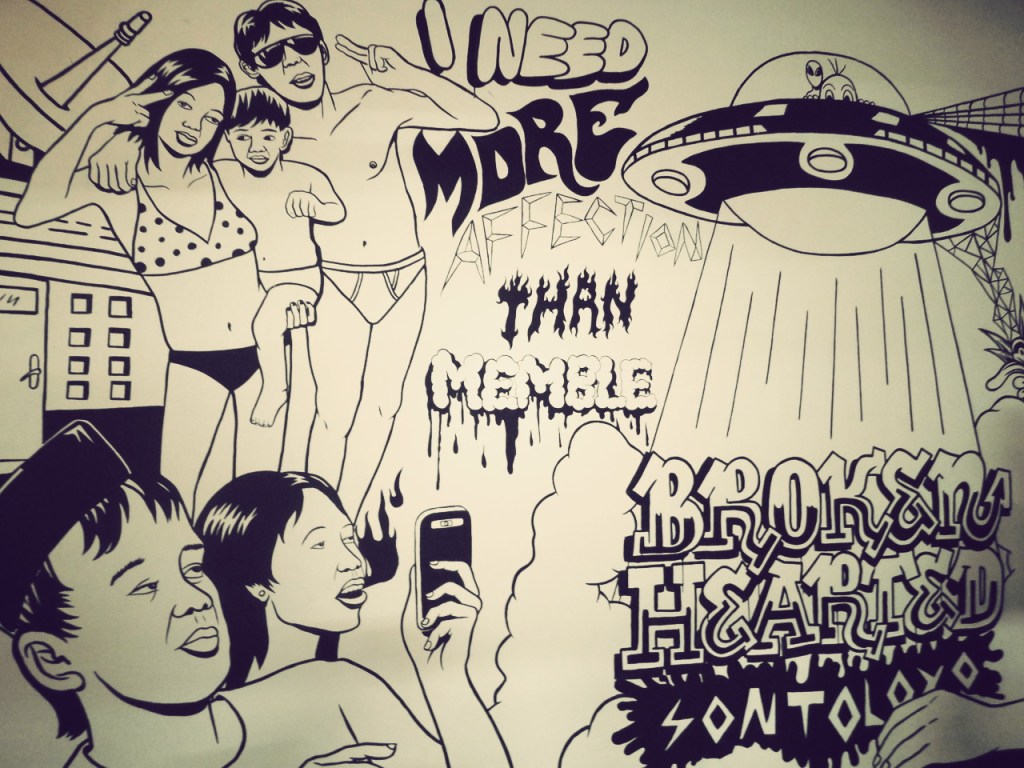Amenk’s ‘I Need Just More Affection ModjokIndehoj’ mural reminds of Tiza Mafira’s recent Jakarta Globe article on the habit of Jakartans to mix-up English and Bahasa Indonesia in daily conversations. In between drawings of a young family in swimsuits and a hijab wearing woman tilting her head for a kiss, the phrases ‘Broken Hearted Sontoloyo’, ‘United of Manja’, and ‘Come back to me ayang’ sneakily indicate that the mixed language could be really on its way to become Jakarta’s vernacular.