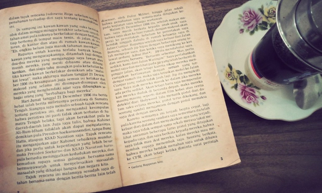 Saya juga menemukan  buku berusia lanjut, Catatan Subversif, karya Mochtar Lubis. Buku yang berisi catatan harian wartawan pemberani itu saat 10 tahun berada dalam tahanan rezim Soekarno. Kertas buku yang menguning dimakan usia seolah menghadirkan kembali getaran emosi penulis saat ia dulu menuliskannya. Saat ia diseret dan dibenamkan ke balik jeruji rezim yang tak henti dikritiknya itu. Saya jadi ikut bertanya-tanya, apa ya yang dirasakan manusia di detik-detik saat ia mengetahui kebebasannya sedang dirampas? Apa ya yang benar-benar dirasakan sang pengarang, atau Hatta, Sjahrir, Pram dan semua pemberani itu saat pada sebuah masa digelandang ke dalam lembabnya penjara? Gentar? Was-was? Mochtar Lubis bilang, ia merasa biasa-biasa saja. Malah ia kepingin melihat bagaimana perlakuan penjara di masa pemerintahan yang baru ini. Ah, beliau ini bergaya sekali.