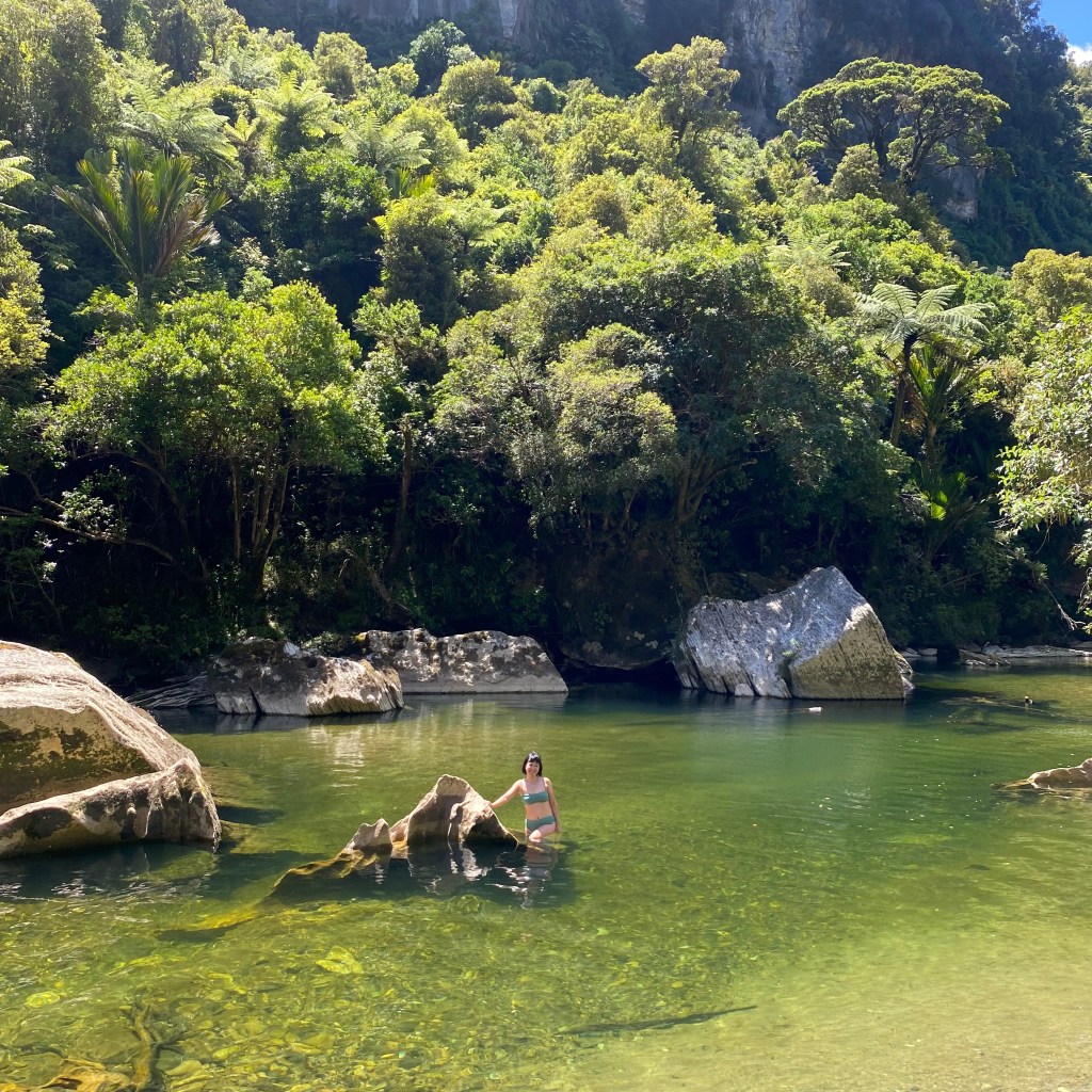 Tadi saya menulis tentang betapa gembira Maesy berenang di sungai Pororari sesudah berjalan di hari yang terik, di tengah hutan dan di antara jajaran pohon pakis. Dengan bercanda saya katakan ia seperti boneka kelinci yang cemberut, yang jadi tersenyum lebar sesudah kupingnya dipegang dan tubuhnya dicelupkan ke air. Ia senang dengan perumpamaan ini. Dan ia memang selalu gembira saat bertemu air. Ide di kepalanya tentang road trip di musim panas adalah menemukan sungai dengan air bening di pinggir jalan lapang, memarkir mobil dan berjalan turun hingga sisi sungai, lalu melompat. Di sungai di bawah jembatan Pelorus ia melompat dari batu dan tawanya kencang sekali. Saya mencatat momen ketika kami duduk di Aoraki, makan bekal buah ceri dan crackers yang dicocol ke pesto, di pinggir danau yang terbentuk dari es yang mencair. Sesekali kami mendengar bunyi bongkahan es yang terjatuh dan nyemplung ke danau, dan di dekatnya ada bebek yang berenang tenang-tenang seolah semua dingin ini ringan saja. Saya membuka catatan beberapa hari sebelumnya dan menemukan percakapan dengan Belinda tentang toko buku kecilnya di Geraldine, toko buku yang ia buka enam minggu saja sebelum pandemi. Bagian belakang toko bahkan belum selesai ia renovasi saat pandemi tiba. Saya ikut tersenyum mencatat waktu Maesy gemetar menyeberangi jembatan gantung di hooker valley, dan ia komat kamit berdoa mengucap syukur akan limpahan kasih sayang yang ia terima, tapi kemudian pidatonya terganggu karena ada pria tua beponco polkadot hijau berjalan di belakangnya dengan langkah besar-besar yang membuat jembatan oleng. Beberapa hari kemudian, di toko buku di Twizel kami menemukan tulisan ini: “It’s beautiful here. In this small room. In this small town. In this small country at the edge of the world.”